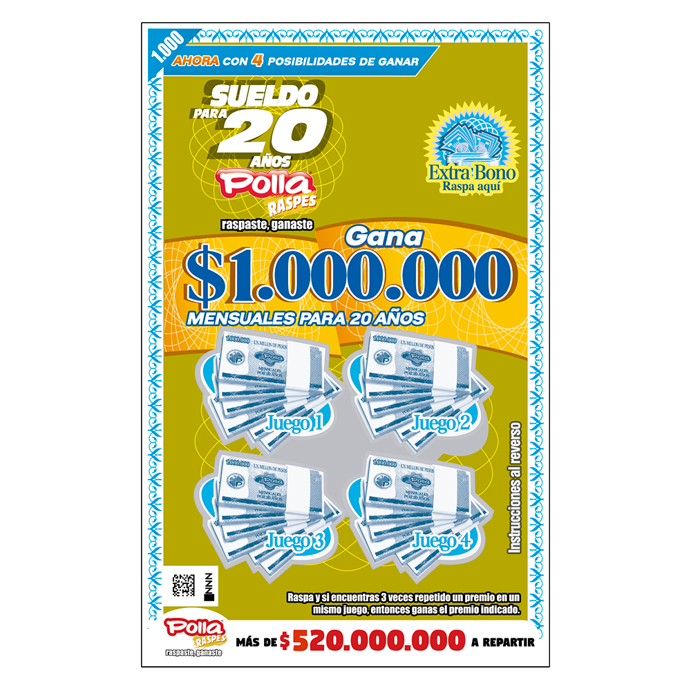 Raspa la zona de juegos (billetes): Si se repite 3 veces la misma cantidad, entonces ganas ese monto. Si aparece 3 veces la palabra “SUELDO”, en un mismo juego, ganas un Sueldo Mensual de $1.000.000 por 20 años. Los Juegos 1, 2, 3 y 4 son independientes entre sí.